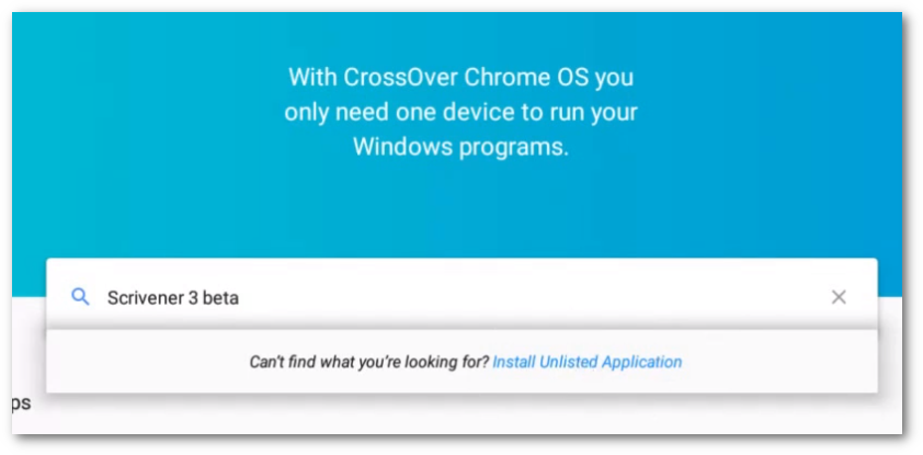 Type Scrivener 3 Beta into the search field. CrossOver will tell you that it can't find the application and give you the option of using an installation file to install it. Click on that option.
